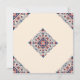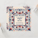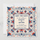 Cartão de salvar a data boho chic, floral geométrico, estilo arte popular boho, vermelho, branco e azul.