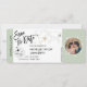 Bilhete de Passagem de Embarque de Praia de Destino Plano Dourado Salve a Data com ícone do coração e do plano com um mapa mundial de arte de linha minimalista simples e cor verde de fundo sage.