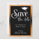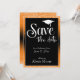 Usando duas fontes distintas, criei gráficos para o seu anúncio. O cabeçalho diz "Salvar a data" e acima dele está um gráfico que representa um boné de formatura. Todo o texto foi colocado sobre um retângulo preto delimitado que cobre um fundo laranja brilhante. Coordenar o confete branco sobre esse fundo mais brilhante, junto com uma imagem de gradiente preto que cria um resultado ombre completa o efeito de borda. Mude a cor de fundo para o que quiser! O boné de formatura também aparece no verso. // 130, 131 //
