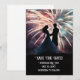 Salve a data! Um lindo convite colorido para amigos e familiares. Um casal romântico é silhueta por belos fogos de artifício.