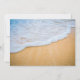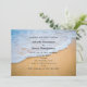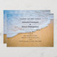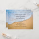 Um convite para o casamento com uma fotografia de uma praia ouro marrom e arenosa com surf branco e água azul.