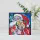 Pintura colorida, branca e artística em acrílico, Papais noeis estão tocando violino na noite de inverno nevada, coruja, ornamentos florais, plantas de inverno, bagas ocas em cores vermelho brilhante, verde, branco, azul, amarelo.