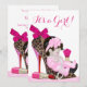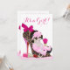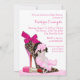 Convite de chá de bebê com sapato de salto alto leopardo rosa com adorável bebê menina usando cordão de pérolas em um elegante lacê, frasco de perfume preto e rosa, batom vermelho e fundo de sapato de salto alto leopardo rosa. Este convite de chá de bebê com sapato de salto alto rosa é facilmente personalizado para o seu evento, adicionando os detalhes do evento, estilo de fonte, tamanho e cor da fonte e texto. Você também pode alterar a cor do fundo neste convite de chá de bebê feminino e fofo.