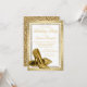Convite de festa de aniversário elegante de mulher branca e dourada com sapatos de salto alto dourados em um fundo de brilho de diamante branco e dourado elegante. Estes convites de festa de aniversário branco e dourado são facilmente personalizados para o seu evento, simplesmente adicionando seus detalhes no estilo de letra e redação de sua escolha.