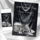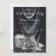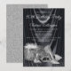 Convite de aniversário preto e prateado para mulher com sapatos de salto alto prateados bonitos, frasco de perfume e presentes em um belo fundo de cetim preto. Este convite de aniversário preto e prateado para mulher é facilmente personalizado para o seu evento, bastando adicionar os detalhes do evento.