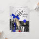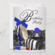 Convite de festa de aniversário elegante em renda, frasco de perfume preto e azul real, batom vermelho e sapato de salto alto zebra azul real. Este convite de festa de aniversário azul real e prata é facilmente personalizado para o seu evento, adicionando detalhes do evento, estilo de fonte, tamanho e cor da fonte e texto.