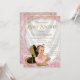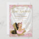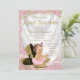 Convite de chá de bebê de sapato de salto alto com sapatos de salto alto glitterados em dourado, uma corrente de pérolas e uma adorável menina de cabelo escuro usando uma tutu rosa rendada e uma linda corrente de pérolas sobre um belo fundo de cetim e glitter dourado. Este convite de chá de bebê elegante em rosa e dourado é facilmente personalizado para o seu evento, adicionando seus detalhes no estilo de letra, cor e fraseado de sua escolha. Você pode remover todo o texto e palavras e adicionar o seu. Este é um design impresso sem cetim, pérolas, glitter, etc. reais.
