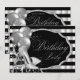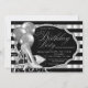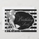 Convite de festa de aniversário preto e prata para mulheres com sapatos de salto alto brilhantes elegantes e balões prateados em um belo fundo listrado de prata e preto. Este convite de festa de aniversário preto e prata é facilmente personalizado para o seu evento, basta adicionar seus detalhes no estilo de letra de sua escolha. Este é um design impresso sem brilho real, etc.