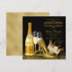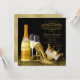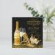 Convite elegante de aniversário preto e dourado para mulher com belos sapatos de salto alto dourados e coroa de princesa ou rainha elegante com garrafa de champanhe dourada e copos sobre um fundo preto e dourado sofisticado. Você pode personalizar facilmente este convite de aniversário preto e dourado para o seu evento simplesmente adicionando seus detalhes. Você pode adicionar o texto de sua escolha à garrafa e pode escolher seu próprio plano de fundo no verso. Simplesmente exclua o(s) que você não deseja. Este é um design impresso sem brilho real, joias, etc.
