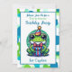 Bons convites de festas de aniversário para o aniversário de um menino. Um sapo adorável de um chapéu de aniversário com um presente com um fundo bolinhas bonito em azul e verde. Adicione suas informações de festa de aniversário na área de personalização.