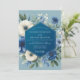 A romantic design featuring a beautiful arrangement of flowers. Elegant ivory and deep sapphire blue anemones are artfully placed amongst soft green leaves. The entire composition is set against a serene, dusty blue backdrop, creating a look of timeless sophistication for your special day.