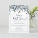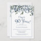 Alegria a 90 Anos de Convite Floral Azul Este convite divertido apresenta videiras e flores azuis e verdes, letras escritas à mão e tipografia clássica.