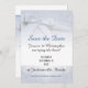 Cartão moderno e na moda de Save The Date de casamento com design de grande laço branco. Com fundo de lantejoulas brancas que se mistura ao branco liso para destacar o texto personalizado. A redação do título é acentuada em um azul médio, tornando-o ideal para casamentos de estilo contemporâneo. E permite que seu texto personalizado se destaque em letras pretas. A metade inferior do design reintroduz o fundo de lantejoulas. O verso do cartão de convite continua o tema com grande laço branco e decoração azul, juntamente com mais acentos azuis médios na forma de sinos e fitas de casamento estilizados.