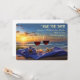 Save the Date beach style with wine! A pretty save the date card with two glasses of wine with a water view as the sunsets.