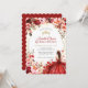 This invitation features a rustic wood-inspired background adorned with vibrant watercolor-style flowers in shades of red, pink, and cream, accented by greenery and gold embellishments. A young woman in an elegant scarlet gown is the focal point, surrounded by whimsical butterflies and subtle sparkling details, creating a sophisticated and celebratory design. You can also add picture at the back of the card.