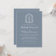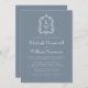 Este elegante design de convite de casamento inspirado em vintage apresenta um par de iniciais de monograma branco em letra serif aberta acima e abaixo de uma linha divisória e rodeado por uma crista de acanthus de uma linha em um fundo azul empoeirado. A parte traseira da placa é azul empoeirado sólido.