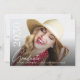 Esta moda, elegante convite para a festa de formatura apresenta uma elegante foto do formando, com a moderna escrita branca da moda, juntamente com o nome do formando, a escola e o ano de aulas de graduação. A parte traseira do convite contém todas as informações da parte e o local. Substitua o exemplo de foto por sua própria foto de formando.