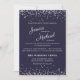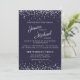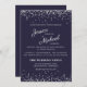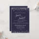 Convite de casamento moderno e na moda em azul marinho com brilho prateado com uma elegante letra cursiva.