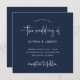 Este convite de casamento minimalista, azul-marinho escuro e branco apresenta uma tipografia moderna de escrita manual e um layout simples e na moda.