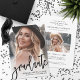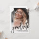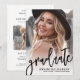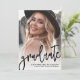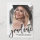 Anúncio de Formatura e Convite para Festa com Estilo Minimalista. A frente apresenta uma foto em página inteira com "Graduado" escrito em letra cursiva preta na parte inferior. Abaixo, o nome do graduado, "Turma de 2026" e o nome da escola são exibidos sobre um gradiente branco sutil que se funde perfeitamente na imagem, garantindo que o texto se destaque.