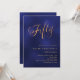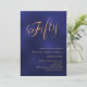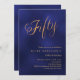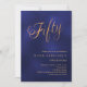 Um convite moderno e na moda para uma festa de aniversário 50ª. Um fundo azul marinho, incolor e a palavra Cinquenta escrita com letras elegantes e grandes em dourado falso. Personalize e adicione um nome e detalhes da parte.