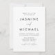 Convites de casamento simples e elegantes, tudo em um, com um roteiro preto, manuscrito, misturado com letras modernas, em um fundo branco. Personalize a frente do convite de casamento minimalista com seu nome e detalhes do casamento. Personalize a parte de trás do convite com detalhes de casamento, como informações de recepção, acomodações de hotel, instruções de RSVP e site de casamento. Adicione o link desejado do site de casamento ao modelo de Código QR fornecido para que seus convidados possam facilmente RSVP on-line e exibir informações adicionais sobre o casamento. Os convites de casamento preto e branco são a escolha perfeita para casamentos modernos.