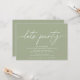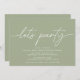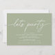 Convites simples e modernos de aniversário com texto de título lendo "vamos party" em script. Adicione os detalhes do evento abaixo. Texto branco sobre um fundo verde sábio.