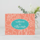 O professor é bem-vindo a cartões de aula com mensagens personalizadas para os alunos. Cor de cor laranja e azul-lacre com padrão de arte de concha em ambos os lados. Personalizar texto na frente com boas-vindas a [qualquer grau]. Por trás, crie uma mensagem com uma escola útil, ou aula, informação, ou fale aos alunos um pouco sobre você como professor deles.