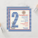 Convites de festas de segundo aniversário de veleiro, azuis, brancos, com o número 2, modelado com tiras azuis, brancas, âncora e roda do capitão. Há uma borda azul e branca listrada ao redor dela. Este design bonitinho tem uma sensação de safra. Adequado para os aniversários de crianças de rapazes e raparigas. Lá atrás há um barco bonito. Esquema de cores: azul, vermelho, castanho, cinza. Alguns elementos de arte de Alice Smith.
