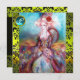 Desenho elegante, colorido, sofisticado e caprichoso em cores vibrantes, rosa fúcsia, azul turquesa, branco, flores de damasco com uma pedra preciosa brilhante 3D. Mulher loira esbranquiçada sofisticada e bonita, tecidos dourados cintilantes azuis e rosados de um traje barroco com penas e uma rosa vermelha. Pintura original em aquarela e acrílico com folha de ouro e cores iridescentes em tela. Este cartão legal e artístico é perfeito para casamentos, cerimônias nupciais, chás de noiva, festas de 16 anos, festas de aniversário de quinceanera, bailes de dança com fantasias, noivados românticos, anúncios de "save the date", Natal, festas de escritório, reuniões de família, coquetéis, celebrações de Ano