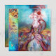 Design elegante, colorido, sofisticado e caprichoso em cores vibrantes, fúcsia, azul-turquesa, branco. Linda mulher loira esbranquiçada e sofisticada, tecidos dourados cintilantes azuis e rosados de um vestido barroco com penas e uma rosa vermelha. Pintura original em aquarela e acrílico com folha dourada e cores iridescentes em tela. Este cartão legal e artístico é perfeito para casamentos, cerimônias nupciais, chá de noiva, festas de 16 anos, festas de quinceañera, bailes à fantasia, noivados românticos, anúncios de "save the date", Natal, festas de Natal no escritório, reuniões de família, coquetéis, celebrações de Ano Novo, aniversários, encontros, concertos, recitais ou qualquer outro evento que você deseje.