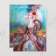 Elegante, colorido, sofisticado e design caprichoso em cores vibrantes, fúcsia, azul-turquesa, branco. Linda mulher loira esbranquiçada e sofisticada, tecidos dourados cintilantes azuis e rosados de um traje barroco com penas e uma rosa vermelha. Pintura original em aquarela e acrílico com folha dourada e cores iridescentes em tela. Este cartão legal e artístico é perfeito para casamentos, cerimônias nupciais, chás de noiva, festas de 16 anos, festas de quinceañera, bailes à fantasia, noivados românticos, anúncios de "save the date", Natal, festas de escritório, reuniões de família, coquetéis, celebrações de Ano Novo, aniversários, encontros, concertos, recitais ou qualquer outro evento que você deseje.