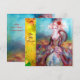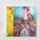 Design elegante, colorido, sofisticado e caprichoso em cores brilhantes, fúcsia, azul-turquesa, turquesa, branco. Linda mulher sofisticada de cabelo loiro esbranquiçado, tecidos dourados cintilantes azuis e rosados de um traje barroco com penas e uma rosa vermelha. Pintura original em aquarela e acrílico com folha de ouro e cores iridescentes em tela. Este cartão legal e artístico é perfeito para casamentos, cerimônias nupciais, chás de noiva, festas de 16 anos, festas de aniversário de quinceañera, bailes de dança com fantasias, compromissos românticos, anúncios de "salve a data", Natal, festas de escritório, reuniões de família, coquetéis, celebrações de Ano Novo, aniversários, encontros, concertos, recitais ou praticamente