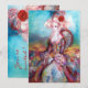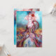 Design elegante, colorido, sofisticado e caprichoso em cores brilhantes, fúcsia, azul-turquesa, turquesa, branco. Linda mulher sofisticada de cabelo loiro esbranquiçado, tecidos dourados cintilantes azuis e rosados de um traje barroco com penas e uma rosa vermelha. Pintura original em aquarela e acrílico com folha de ouro e cores iridescentes em tela. Este cartão legal e artístico é perfeito para casamentos, cerimônias nupciais, chás de noiva, festas de 16 anos, festas de aniversário de quinceañera, bailes de dança com fantasias, noivados românticos, anúncios de "save the date", Natal, reuniões de escritório, reuniões de família, coquetéis, celebrações de Ano Novo, aniversários, encontros, concertos, recitais ou praticamente qualquer evento
