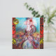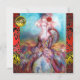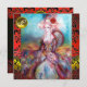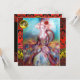 Elegante, colorido, sofisticado e design caprichoso em cores brilhantes, fúcsia, azul-turquesa, turquesa, branco com uma pedra preciosa topázio amarelo 3D brilhante. Linda mulher loira esbranquiçada sofisticada, tecidos dourados cintilantes azuis e rosados de um traje barroco com penas e uma rosa vermelha. Pintura original em aquarela e acrílico com folha de ouro e cores iridescentes em tela. Este cartão legal e artístico é perfeito para casamentos, cerimônias nupciais, chás de noiva, festas de 16 anos, festas de aniversário de quinceanera, bailes de dança com fantasias, noivados românticos, anúncios de "save the date", Natal, festas de escritório, reuniões de família, coquetéis, celebrações de