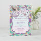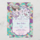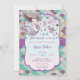 Um convite de chá de fraldas de sereia, com uma bela sereia e adorável sob as criaturas do mar contra o fundo do oceano profundo do arco-íris. Personalize-o com os detalhes do seu partido de forma fácil e rápida, basta pressionar o botão personalizá-lo para reorganizar e formatar o estilo e o posicionamento do texto. Itens correspondentes disponíveis no repositório! (c) O feliz Cat Studio.