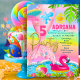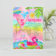 Convite de festa de sereia com brilho rosa Praia mar piscina sol verão pássaros bola de praia flamingo Folha Selvagem Ouro Folhas de Palmeira Coloridas.