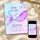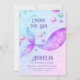 Convite de aniversário de sereia com cauda mágica de sereia e tipografia decorativa. A design apresenta uma cauda das sereias e bolhas oceânicas em tons de aquarela de verde roxo rosa e azul. Fácil de editar para qualquer idade e perfeito para festa de sereia, festa de piscina, princesa feminina e sob os temas do mar.