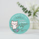 Um convite simples, azul e redondo para o aniversário de uma menina, com uma adorável gata sereia à esquerda e o texto à direita. O nome está escrito em letras cursivas rosa, a ocasião em branco, o restante em letras maiúsculas pretas pequenas. Acima de tudo, está o texto arqueado "Splish! Splash! Meow! Purr" na mesma fonte, mas branco.