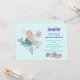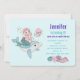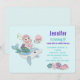 Um convite de festa de aniversário com uma ilustração adorável. Projetado com uma linda menina sereia montando um golfinho feliz. Um pequeno amigo de água-viva os acompanha. Decorado com pequenas manchas de brilho dourado falso.