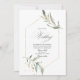 Convite de casamento com vegetação floral em aquarela em tons pastéis com moldura geométrica dourada personalizável para os detalhes do seu evento.