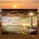 Convite para comemoração ou funeral com uma cena costeira com o símbolo eterno de esperança: um farol. O pôr do sol sobre o oceano também pode ser visto como simbólico, representando o fim de uma vida (esperemos que longa e feliz). As luzes estão guiando o caminho para a vida após a morte. Também se a pessoa morta era amante do oceano ou pediu que suas cinzas se espalhassem no mar, esta é uma forma excelente de se reunir e dizer uma despedida final.