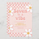 Sete é um Clima Garota Groovy Convite de aniversário de 7 anos inspirado no retro com fontes estilo anos 70 e margaridas e padrão xadrez.