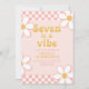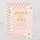 Sete é um Clima Garota Groovy Convite de aniversário de 7 anos inspirado no retro com fontes estilo anos 70 e margaridas e padrão xadrez.