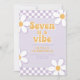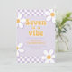 Sete é um Clima Garota Groovy Convite de aniversário de 7 anos inspirado no retro com fontes estilo 70 e margaridas e padrão xadrez.