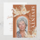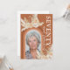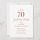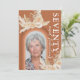 Convites de festa de 70 anos de idade com tema rústico boêmio, apresentando um fundo laranja queimado com um arco de arco-íris, uma foto da aniversariante, folhas de palmeira secas em aquarela no deserto, grama pampas, flores e um modelo de texto de celebração de setenta anos elegante no verso que é fácil de personalizar.