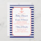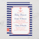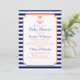 Uma silhueta de âncora de cor coral está sobre um fundo de listras horizontais brancas e marinhos azuis.