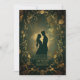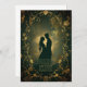Silhueta de um casal apaixonado, uma ilustração de cartão de casamento com um quadro floral ouro sobre um fundo verde escuro, uma atmosfera romântica e sonhadora.