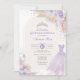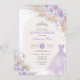 O convite perfeito para a quinceañera da sua filha está finalmente aqui! Este convite para a lavanda da quinceañera apresenta rosas púrpuros macios pastéis, um vestido elegante de bola princesa, uma tiara prateada cintilante e elementos de boho tropical. Clique no botão "personalizar mais" se quiser reorganizar e formatar o estilo e a posição do texto.
