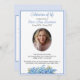 The invite features an oval shaped portrait photo with elegant simple border of a sage green line. Blue small pretty flowers symbolizes everlasting love and remembrance.